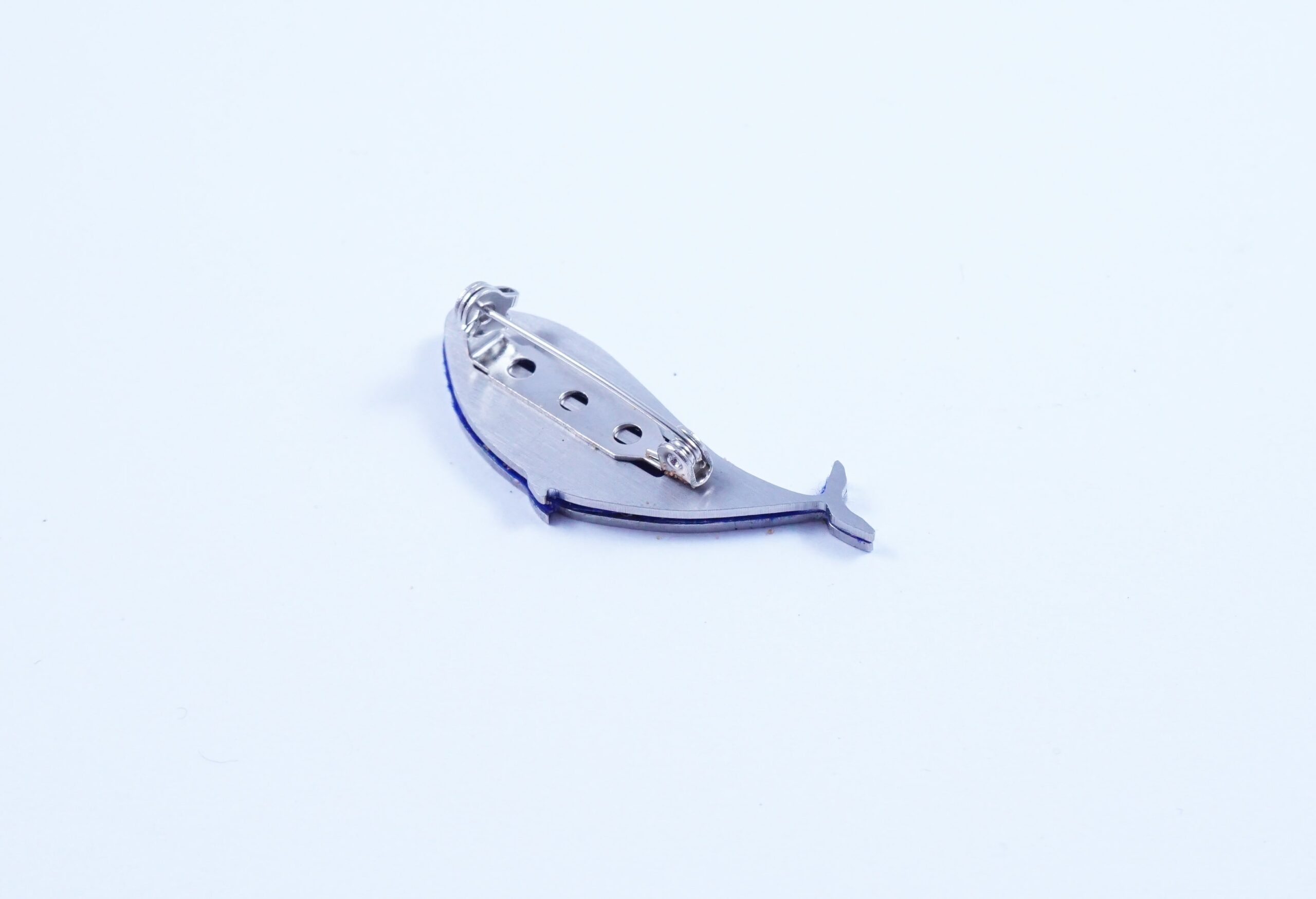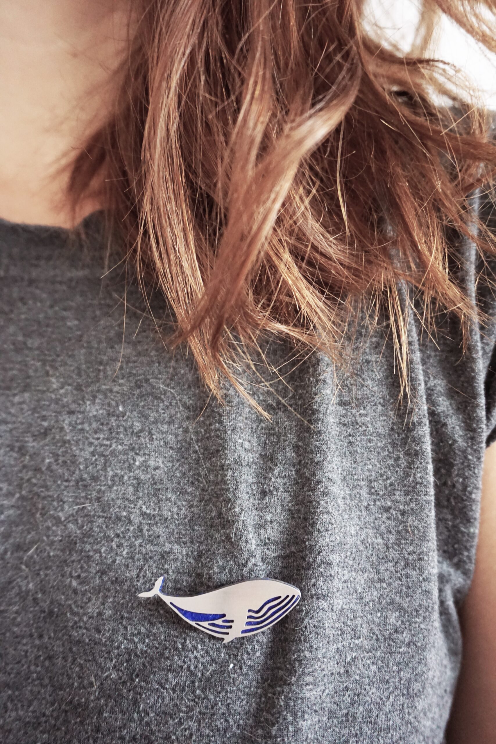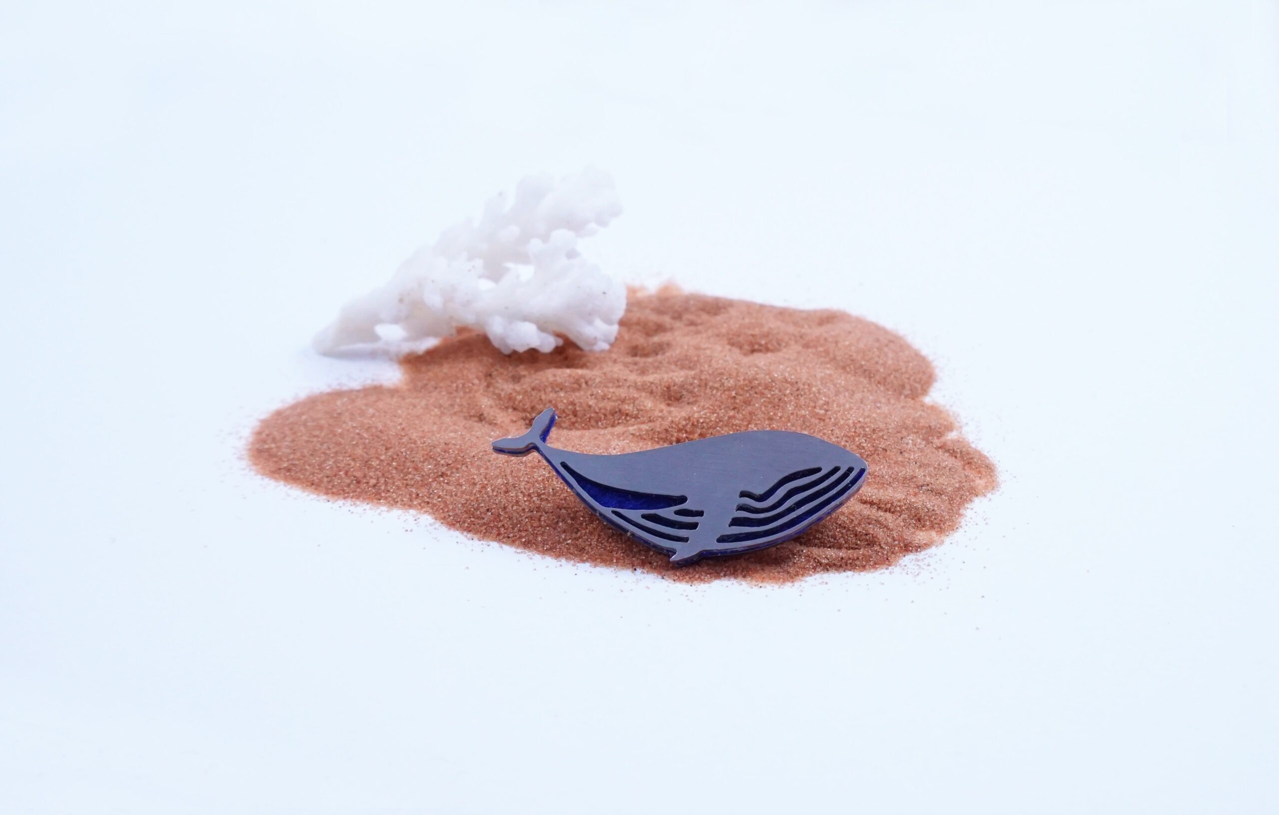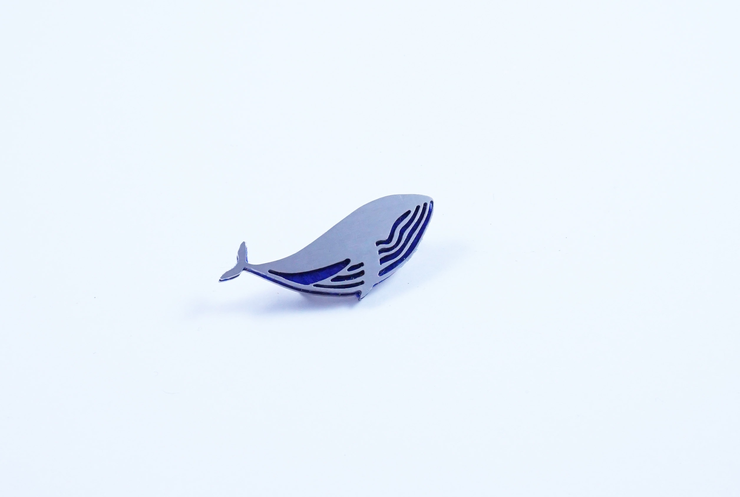 Brož je vyrobena z broušené nerezové oceli doplněné tmavě modrým filcem (možno vybrat jinou barvu). Rozměry 45 x 15 mm. Brož velryba je součástí velrybí kolekce, společně s náušnicemi a řetízkem.