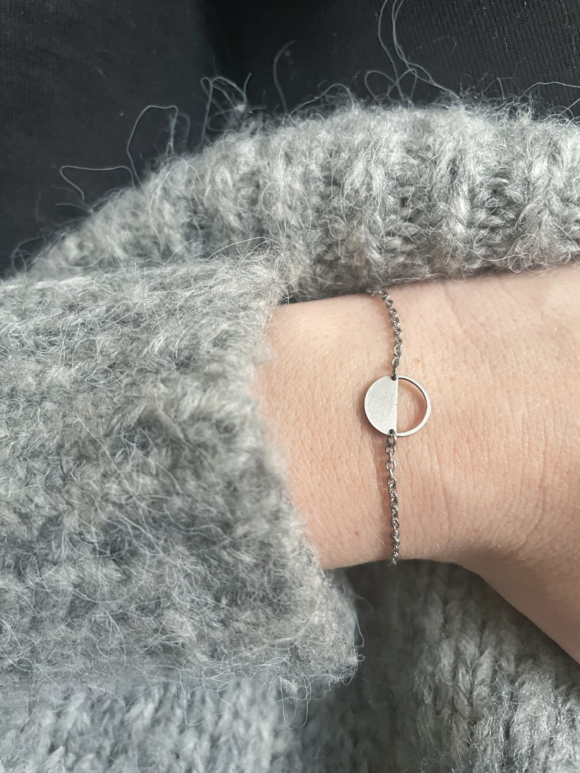 Náramek půlkruh je vyrobený z broušené nerezové oceli. Nerezová ocel je materiál, který se vyznačuje hlavně svou pevností, stálostí a houževnatostí. Její hlavní výhoda však je, že se jedná o antialergenní materiál, takže se nemusíte bát alergických reakcí. Velikost přívěšku je 10 mm. Délka náramku na přání. Náramek je ukončen pomocí klasického zapínání.